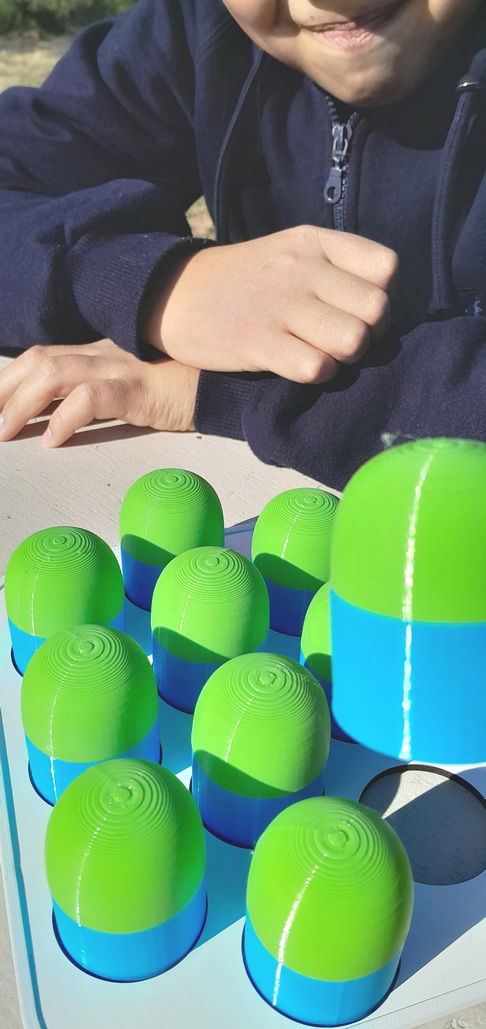 Incluye 1O cápsulas de PLA impresas en 3D (no tóxico, ecológico y resistente), diseñadas en pares idénticos, con pequeños elementos en su interior que producen sonidos distintos. Cada cápsula emite un sonido diferente al agitarla, y el objetivo es encontrar su par por el sonido que genera, no por el aspecto visual.